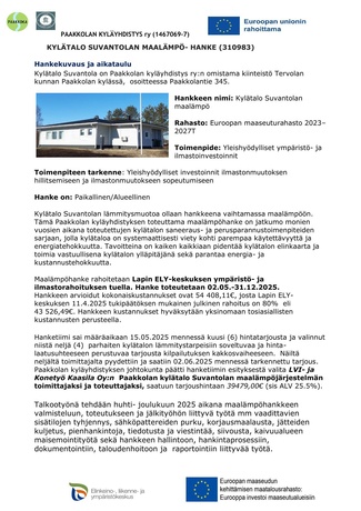 Paakkolan kylätalo Suvantolan lämmitysmuoto on Lapin ELY-keskuksen rahoittamana hankkeena vaihdettu kesän ja syksyn 2025 aikana maalämpöön. Tämä Paakkolan kyläyhdistyksen toteuttama maalämpöhanke on jatkumo monien vuosien aikana toteutettujen kylätalon saneeraus- ja perusparannustoimenpiteiden sarjaan, jolla kylätaloa on systemaattisesti viety kohti parempaa käytettävyyttä ja energiatehokkuutta.